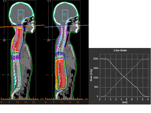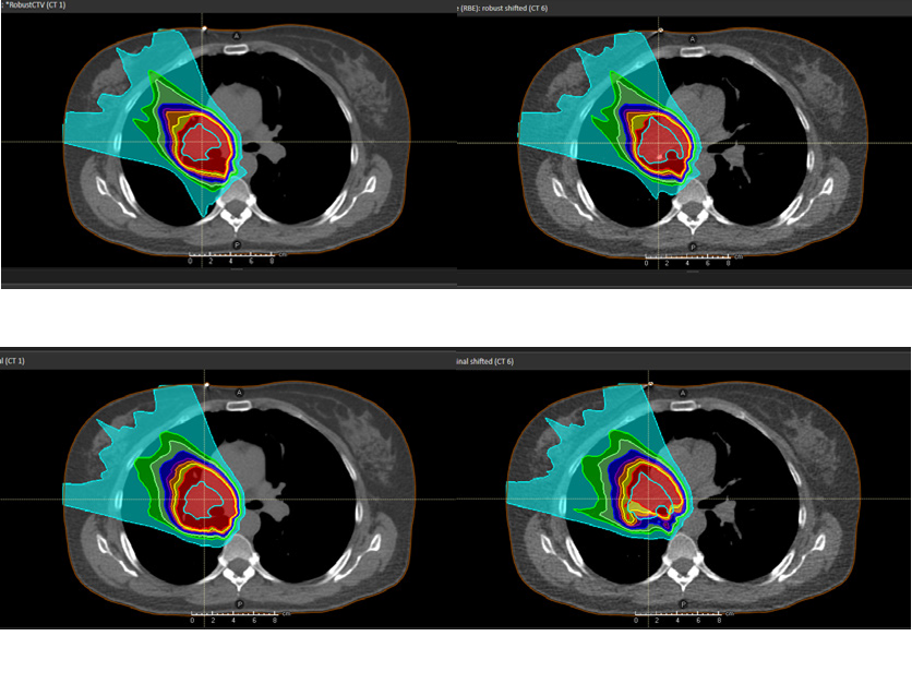 Robust optimization for IMPT applied to a 4D-CT lung case subject to at most 0.5 cm setup errors and 3.0 % density errors was compared to margin-based planning. The ten phases of the 4D-CT were included in the robust optimization. Transversal slices of the planning CT (CT 1) under the nominal scenario and of a non-planning CT (CT 6) under a perturbed scenario are shown in Figure 2. The figure illustrates that robust optimization can lead to improved robustness at the same time as decreased integral dose compared to conventional margins.