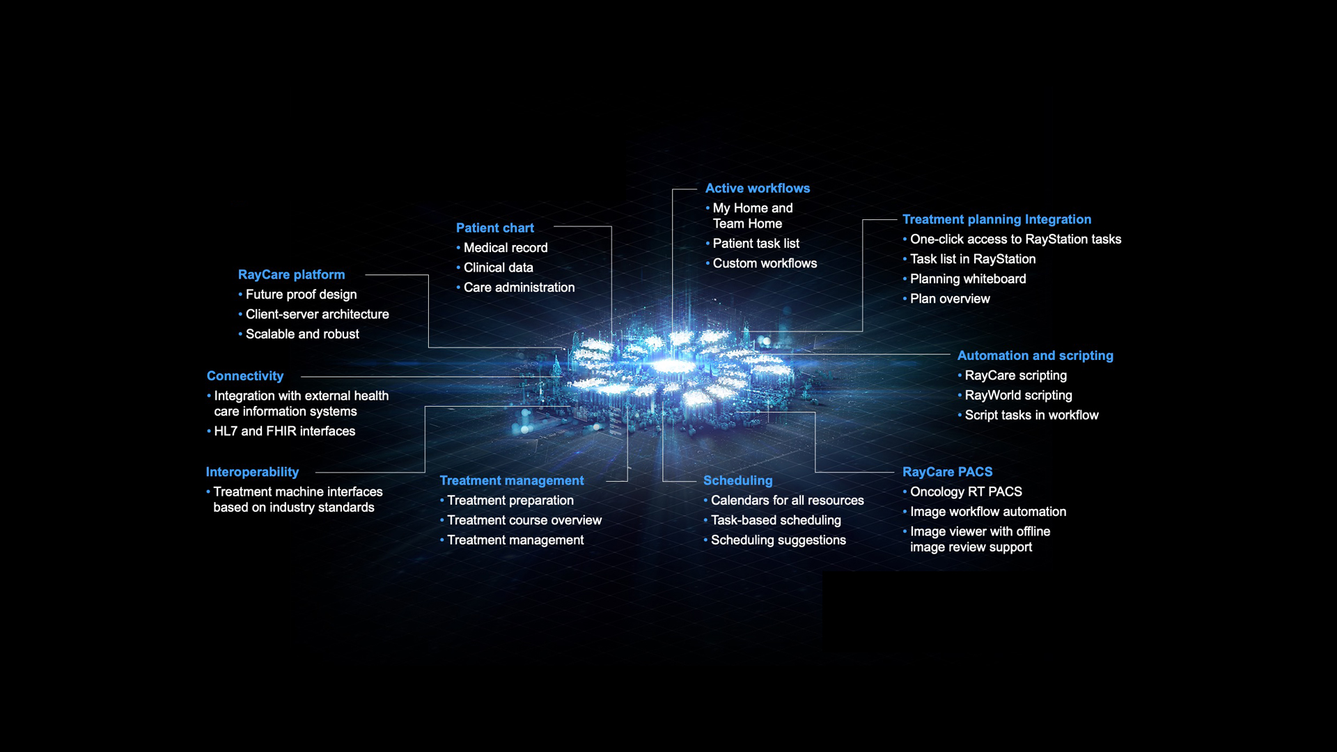 RayCare is designed to connect to all resources in the oncology center. It also interfaces to hospital information system and EMR, hospital PACS and RIS, patient portals, pharmacy systems, lab systems, billing systems.
